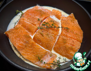 И залил я молоком. До уровня — середина ломтя. Можно и сливками залить было. Но лосось рыба и без того весьма жирная. И молока ему хватит. -