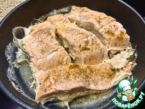 Лосось был в виде филейного пласта на коже. Нарезал я его на ломти порционные. Выложил на толстостенную, вернее толстодонную, чугунную сковороду. Вниз кожей, что примечательно.